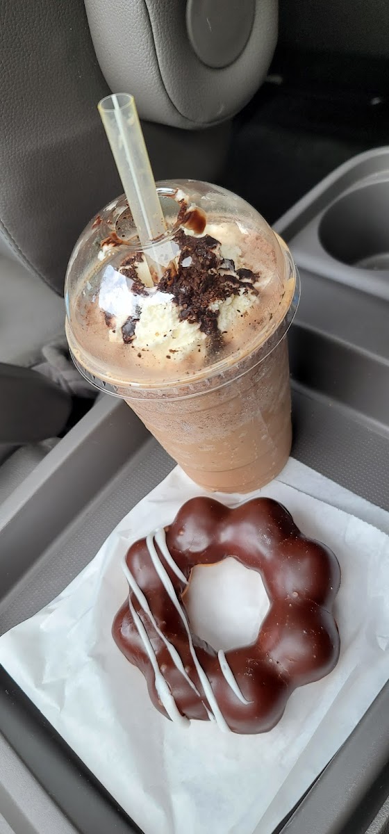 Stopped in for a quick breakfast. I ordered the Dalgona Matcha Latte and my husband got just a hot cafe latte (essentially espresso and milk with no sugar). Also, got one cronut and one black sesame mochi-nut to share. Dalgona matcha latte: dalgona had simple and not too sweet flavor, lacked matcha flavor and mostly tasted of milk otherwise. Cafe latte: simple and nothing bad or good to say according to my husband Black sesame mochi-nut: Extremely good, light and chewy. Not too sweet and mostly only where the icing was. Will be back to try more flavors. Cronut: Dipped in sugar, very sweet but also very heavy in comparison to mochi-nut. Not a big fan and prefer the mochi-nuts over this. Aesthetic of the place is pleasant and makes you want to take your time to eat and talk. Has rustic and asian influenced decor, makes it feel cozy quiet and pleasant. Service is quick to attend but they do get busy quickly since it seemed more people liked their drive thru rather than going inside. Did not have to wait long for food or drinks.